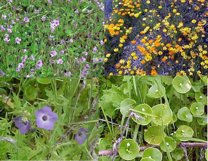 Lower left appears to be a Bolander's Phacelia and upper left appears to be a Linanthus.