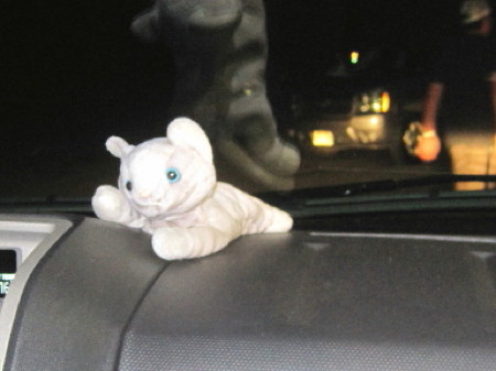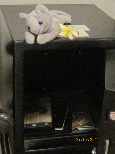 Here is Lucky Kitty when we picked up our rental car, and with the leis we got at a luau.