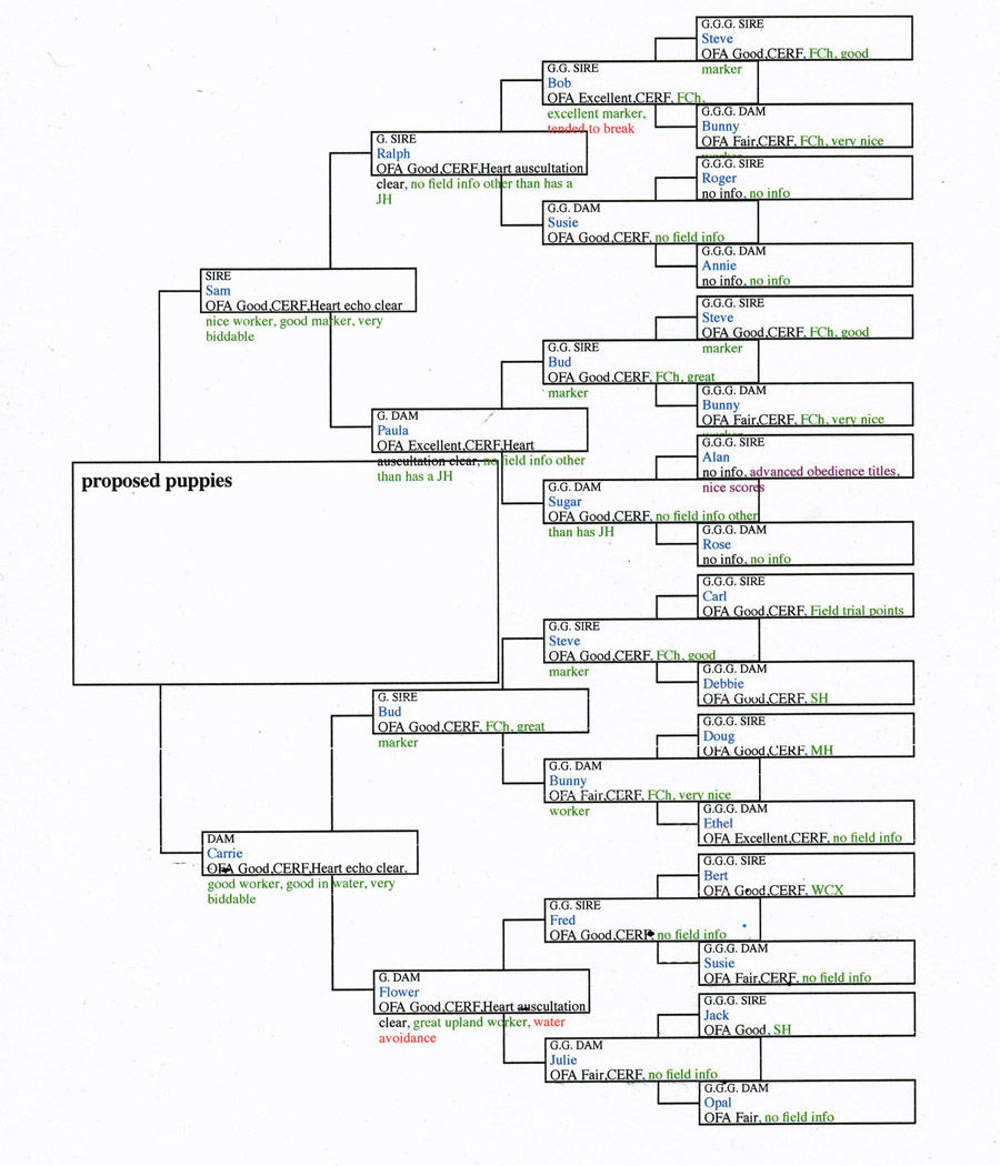 The easiest way to read a pedigree of a proposed breeding is first to look at the surface - how many of the dogs in the pedigree are OFA, CERF, fully coated? Did any seize or have heart problems? How many field titles are there? How many of these dogs have you had a chance to see in person, to touch? Then, do depth on any pedigree that makes it thru a surface check - how many siblings of the dogs in the pedigree OFA'd, CERF'd, were fully coated? Did any seize or have heart problems? What is the depth of pedigree for field work traits?