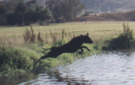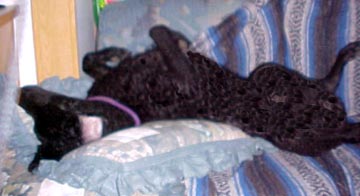 | Diver's first love is field work, and he did that well for nine years. He is the first and only Curly with the NAHRA MHR and GMHR, the last earned with me staggering about on a cane, something he never took advantage of. He also has a leg on his MH, but just prior to finishing his GMHR he was sucked into an intake pipe between ponds and lost half his hearing. No longer able to hear whistles at a distance or duck calls from throwers, he had to be retired from active field work, tho he does get a chance to play when other dogs are being trained. He also ran test dog for the WCQ land series at the 2005 CCRCA National test and I am proud to say he was the only one to do it without handling - he has passed the WCQ at least five times (I've lost count). | ||||||||||||||