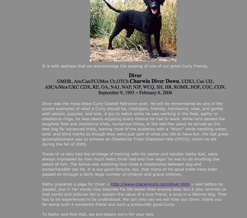 | Most folks put up a tribute page after a dog has passed, but I thought I'd jump the gun. Hopefully by many years! Diver has been the definition of "once in a lifetime dog" for me, in so many different ways, that I thought it was fitting to pay tribute to him now. He is the most titled male Curly in the world and was the most titled in both sexes until 2008. | ||||||||||||||